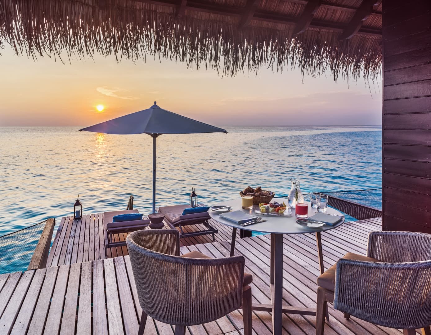 Water villas feature airy and comfortable living spaces and a bathroom with a designer bathtub. The master bedroom is equipped with a flat-screen TV, a king-sized bed and stunning views of the ocean. There is a terrace with a private pool and a day bed.