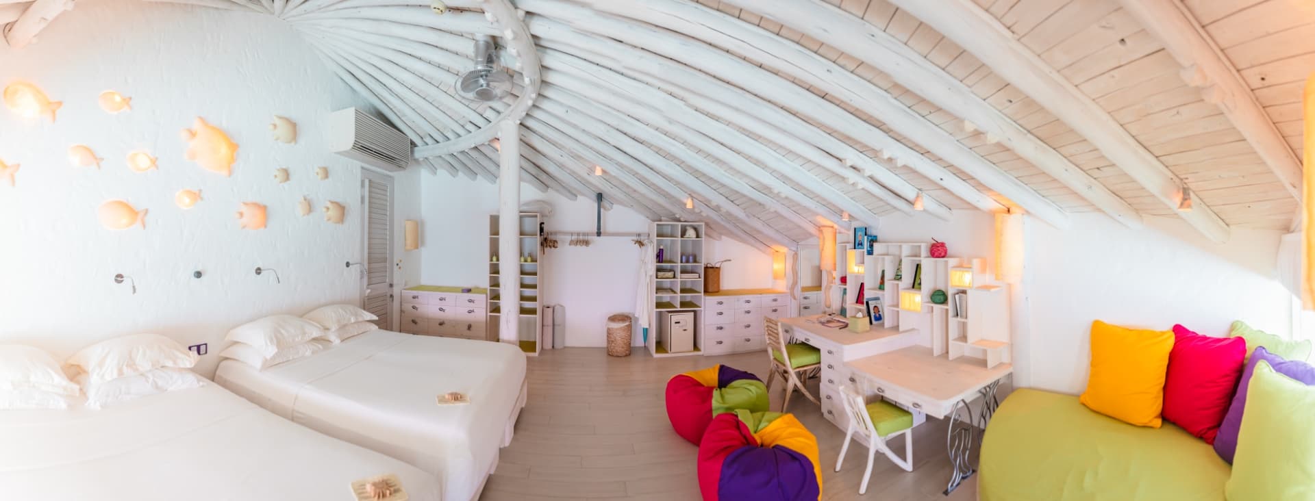 This 4-Bedroom Water Reserve with Slide is spread across two floors and comes with a private pool and a curved water slide delivering you directly into the lagoon. With a size of 1,421 sqm, it can accommodate up to 10 people.