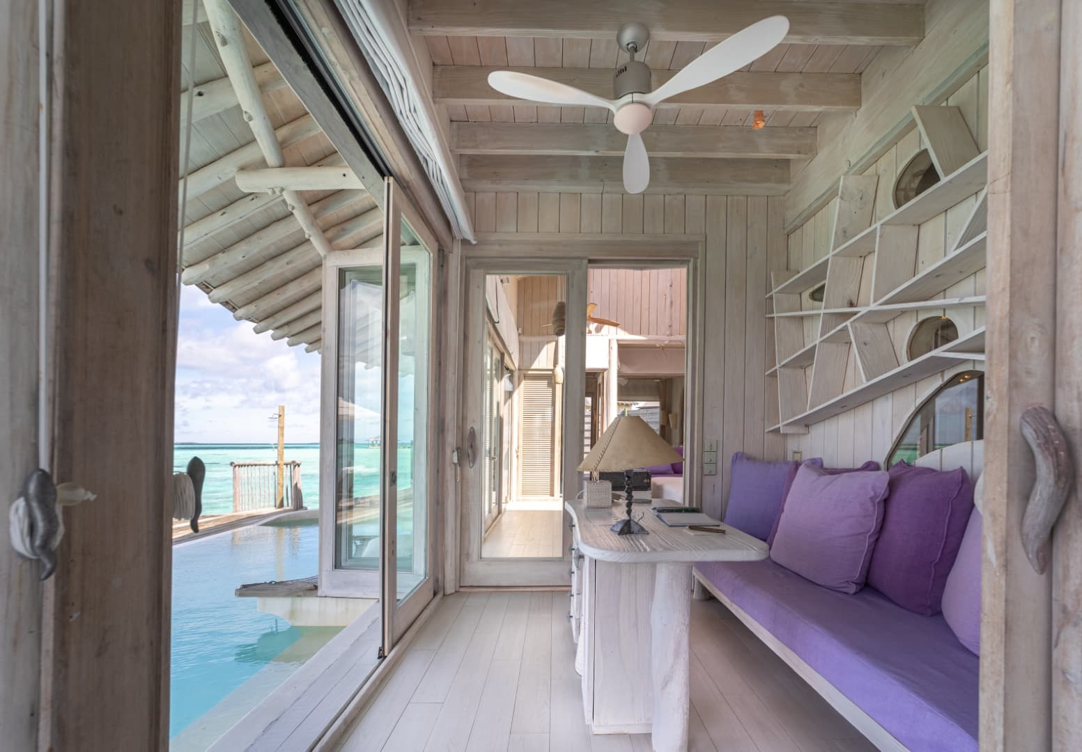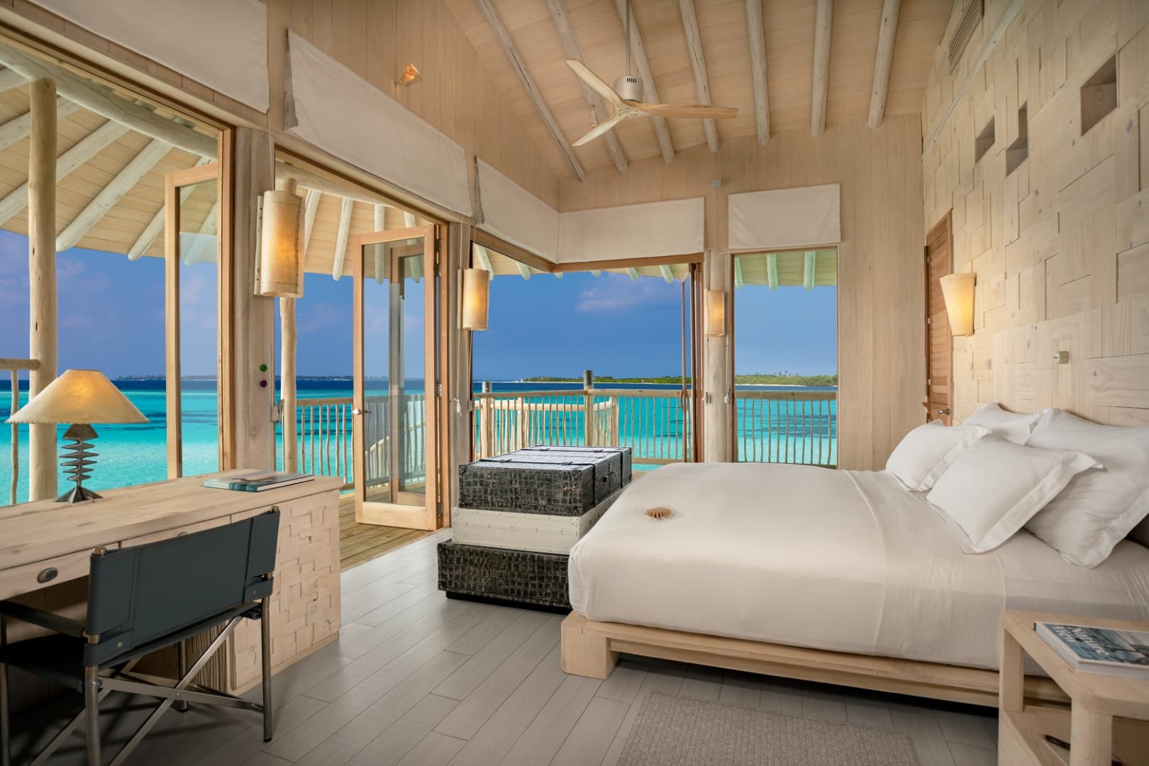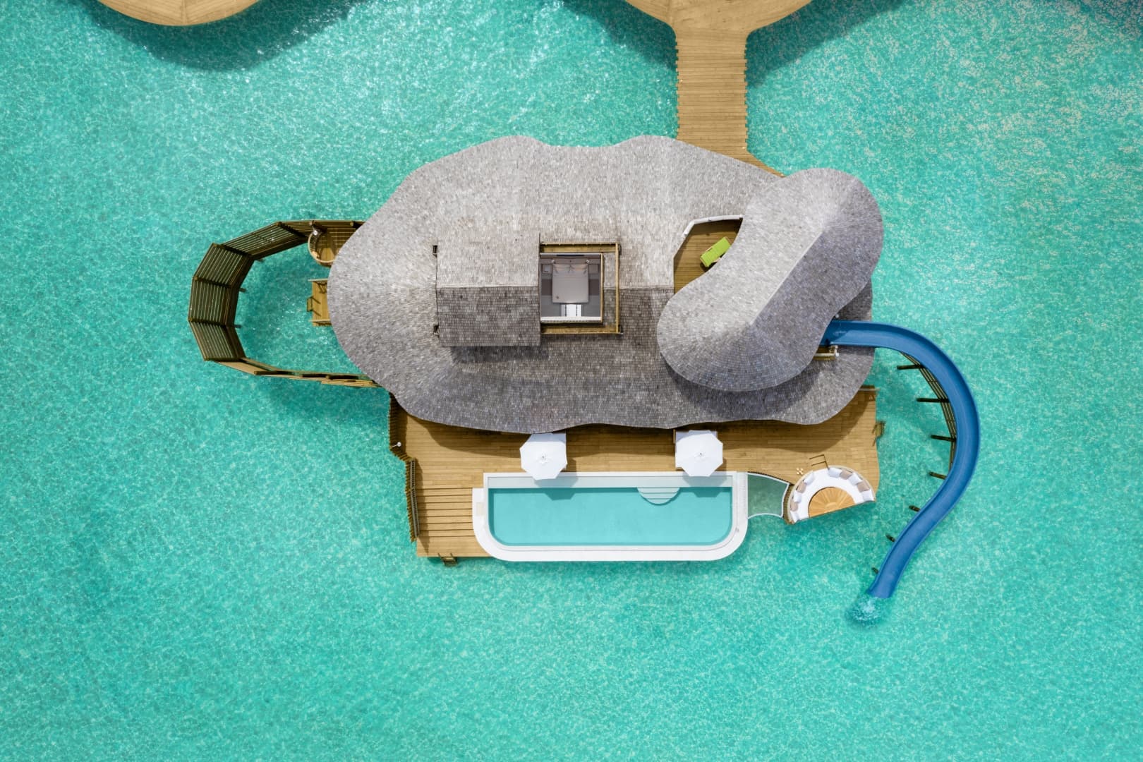 This luxurious over-water villa includes a master bedroom with a retractable roof, accessible with just the push of a button, that opens up to a star-filled sky. Guests can step out of the villa and directly into the lagoon and enjoy the signature outdoor bathroom with a shower and sunken bath. The outdoor deck has a private freshwater pool, a sunken dining area, a swing, daybeds, a swing and catamaran nets for lounging.