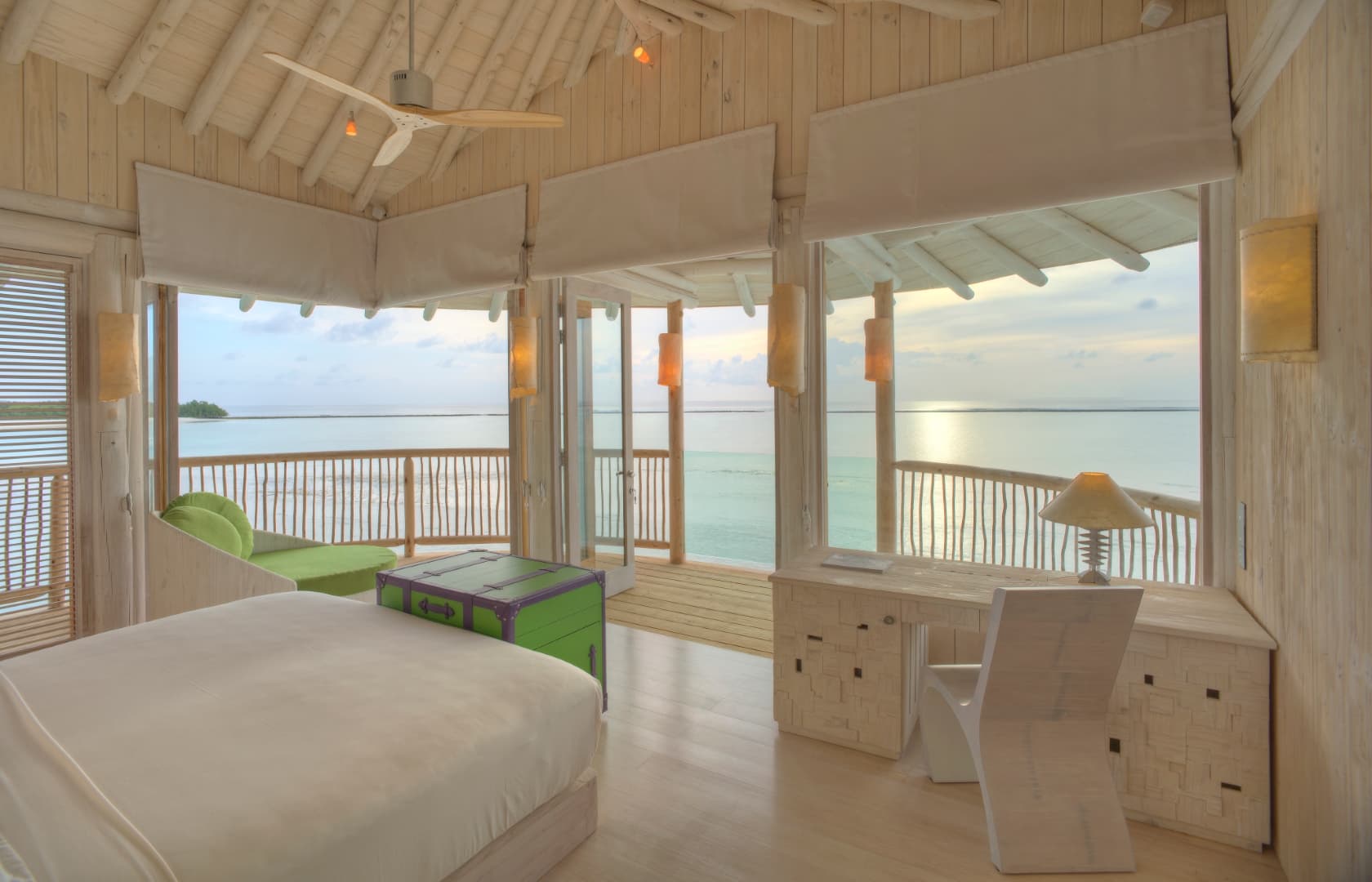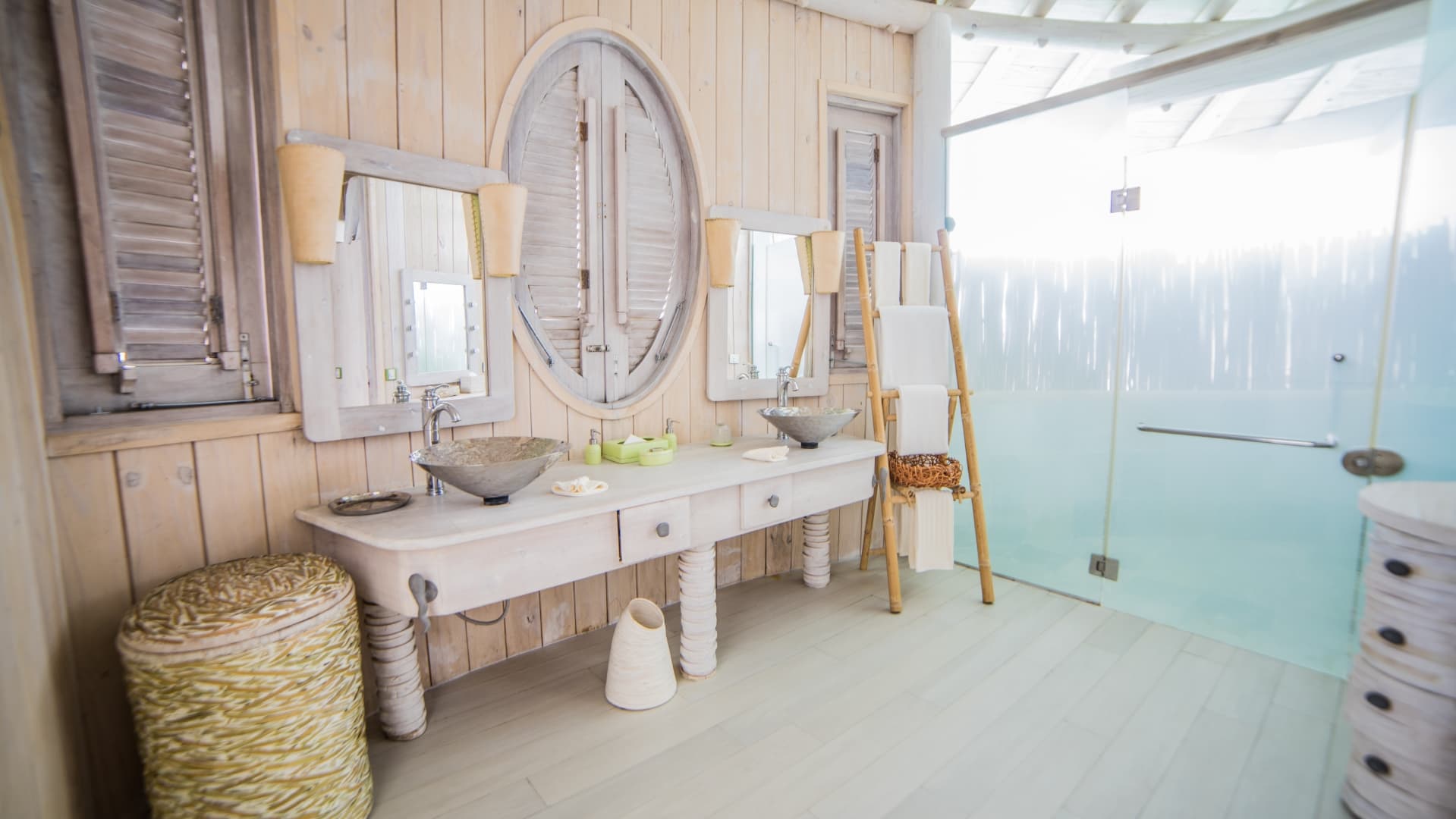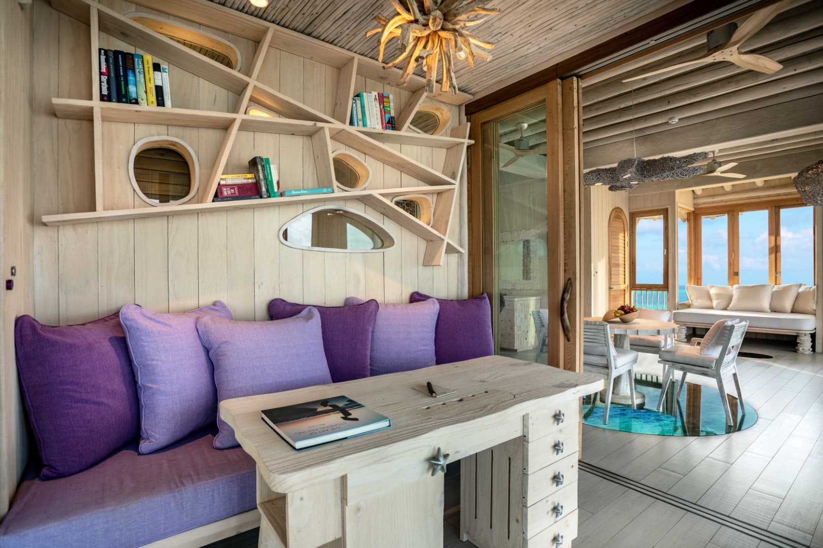 This luxurious over-water villa includes a master bedroom with a retractable roof, accessible with just the push of a button, that opens up to a star-filled sky. Guests can step out of the villa and directly into the lagoon and enjoy the signature outdoor bathroom with a shower and sunken bath. The outdoor deck has a private freshwater pool, a sunken dining area, a swing, daybeds, a swing and catamaran nets for lounging.