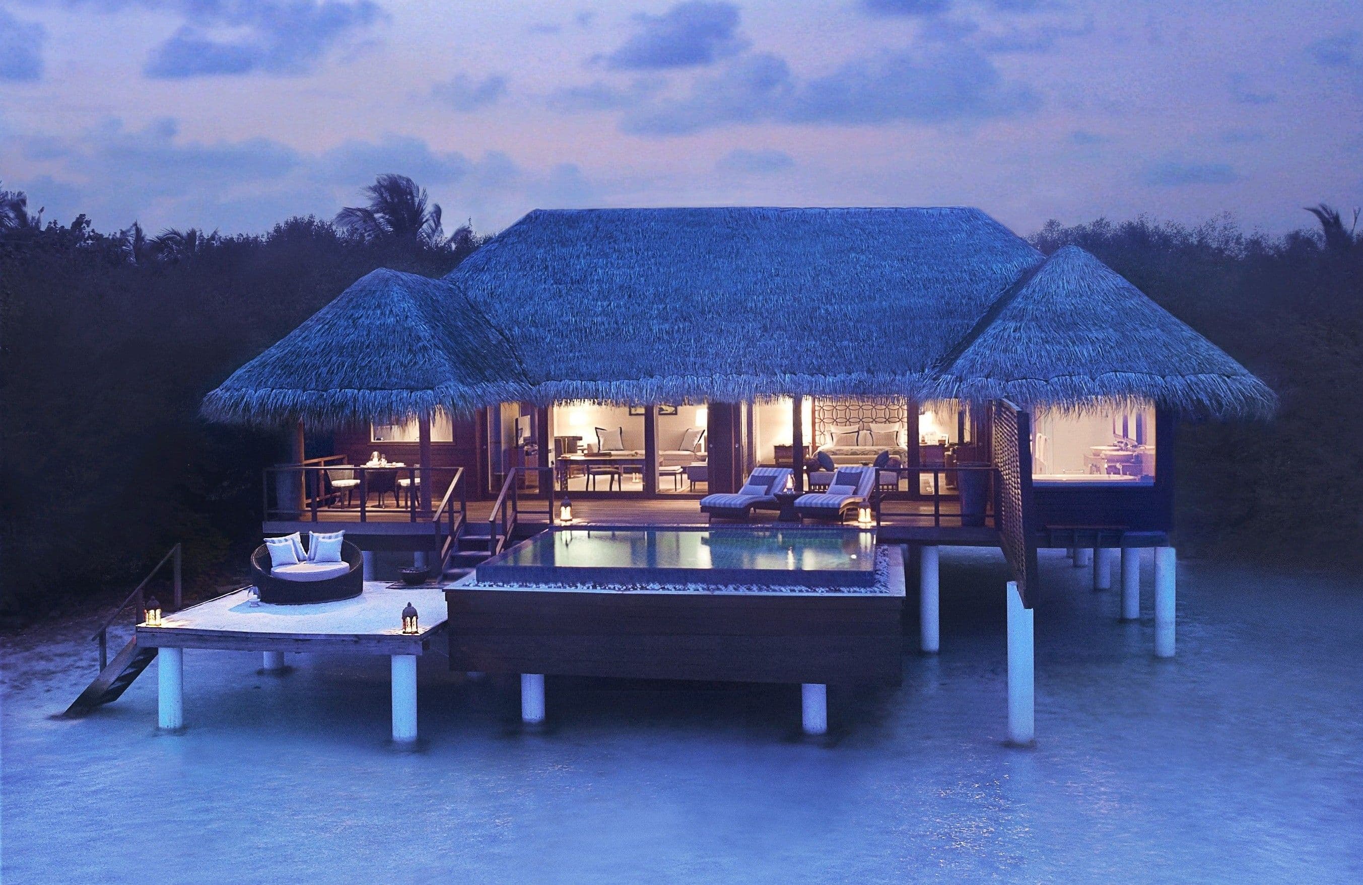 This luxurious over-water villa includes a master bedroom with a retractable roof, accessible with just the push of a button, that opens up to a star-filled sky. Guests can step out of the villa and directly into the lagoon and enjoy the signature outdoor bathroom with a shower and sunken bath. The outdoor deck has a private freshwater pool, a sunken dining area, a swing, daybeds, a swing and catamaran nets for lounging.