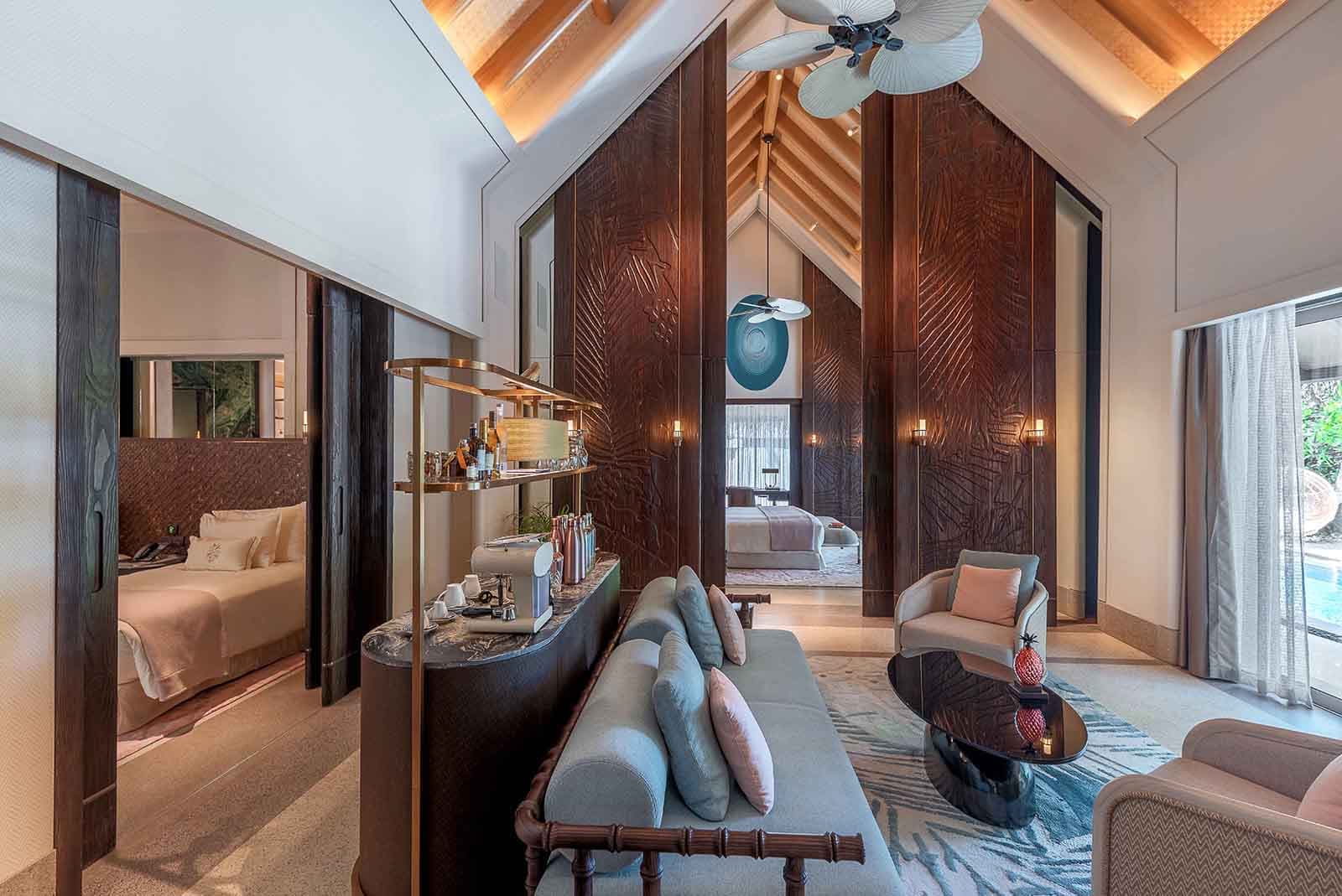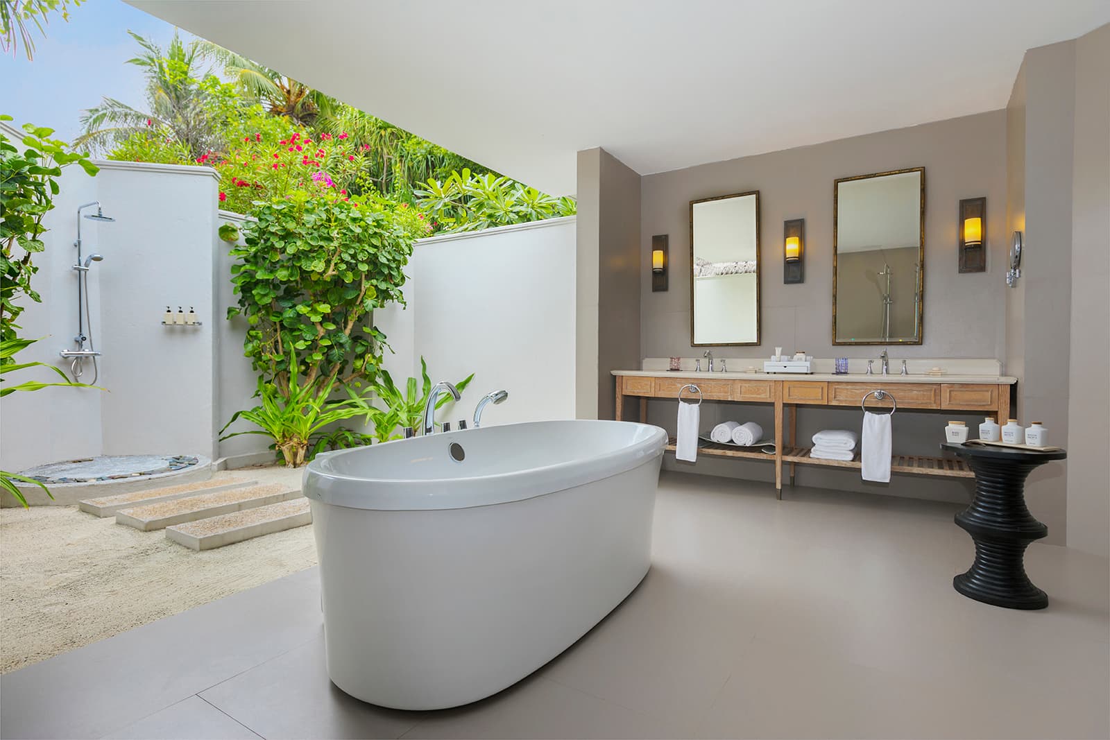 Combining rustic and modern styles, this Two Bedroom Beach Sunset Villa offers plenty of space for families. Situated on the edge of stunning white sand beaches and surrounded by lush tropical gardens, this accommodation features two en-suite private bathrooms and separate showers, twin vanities, a large open-plan living and dining area and a wine fridge. Outside, you are greeted with a private outdoor bathroom. the swimming pool and a relaxation and dining area, where you can unwind.